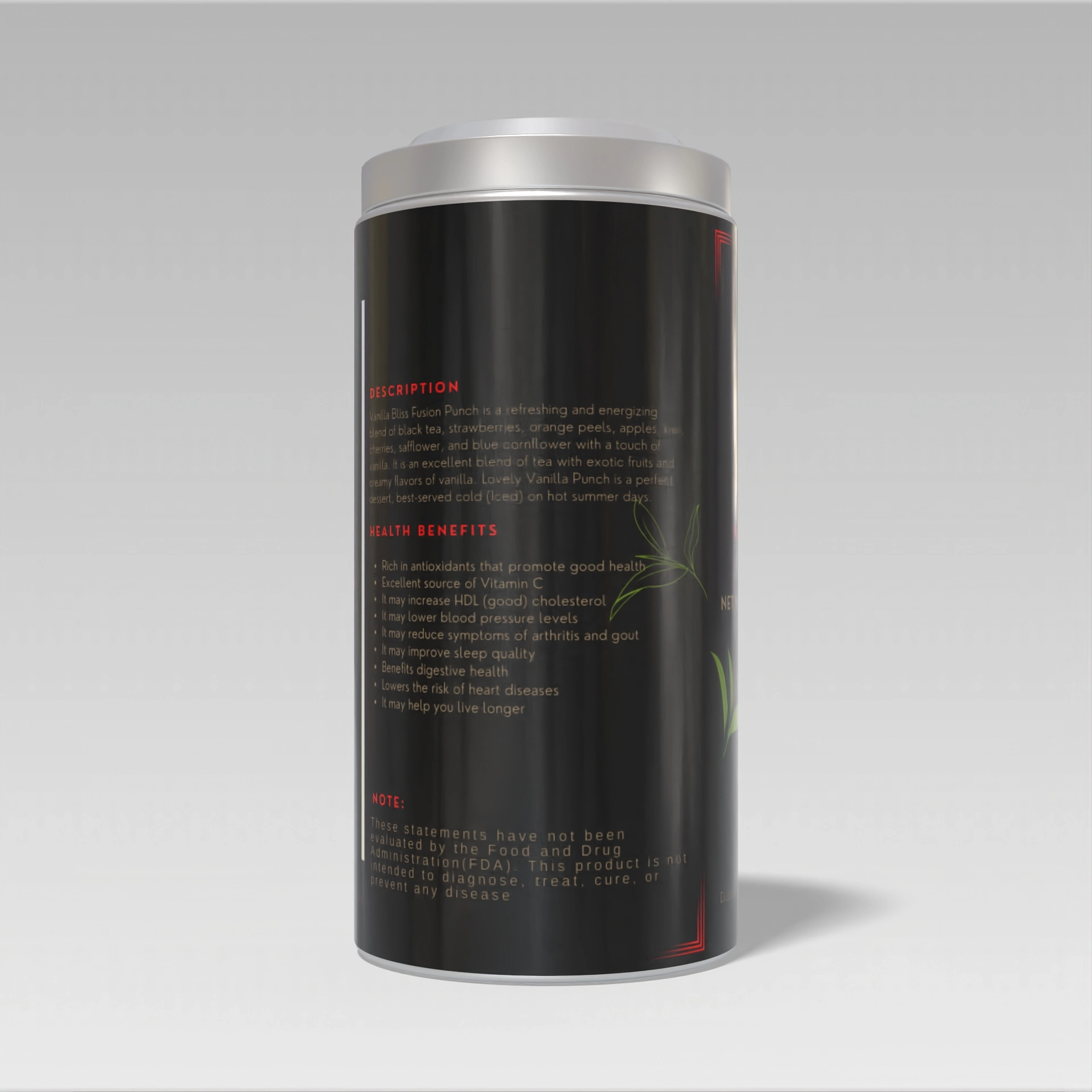Discover pure indulgence with our Vanilla Bliss Fusion! This refreshing and energizing blend is a symphony of flavours, combining robust black tea with a vibrant medley of exotic fruits including strawberries, orange peels, apples, kiwi, and cherries, all harmonized by the delicate essence of safflower, blue cornflower, and a hint of creamy vanilla. It's an exquisite combination that creates the perfect dessert tea, especially when served chilled on a warm summer day.