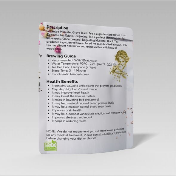 With 20 servings per 50g pack (available in both convenient pouches and elegant tins), Goomtee Muscatel Grove Tea is your ideal companion for a sophisticated and health-conscious tea experience. Its unique flavour profile and numerous benefits make it a delightful addition to your daily routine.