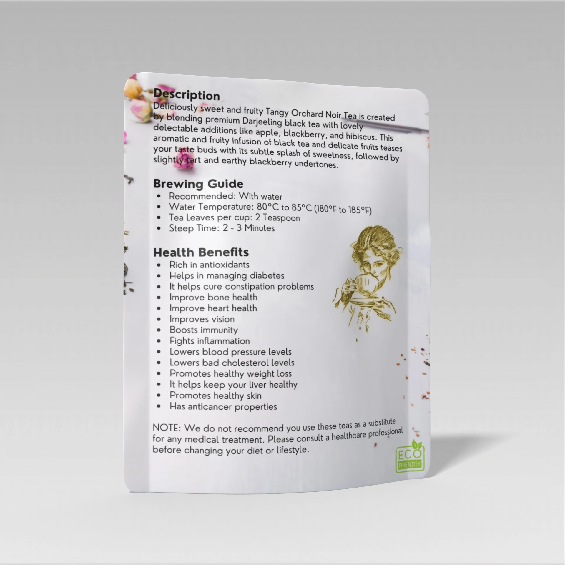 Indulge in the vibrant and refreshing taste of our Tangy Orchard Noir! This delightful blend combines premium Darjeeling black tea with the natural sweetness of apple, the subtle tartness of blackberry, and the bright, floral notes of hibiscus. The result is a beautifully balanced black tea with a subtly sweet initial taste from the apple, followed by slightly tart and earthy blackberry undertones. Enjoy its complex flavour both hot and cold, making it a versatile addition to your tea collection.