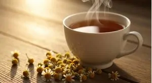 Tasse de camomille fumante avec des fleurs de camomille séchées.