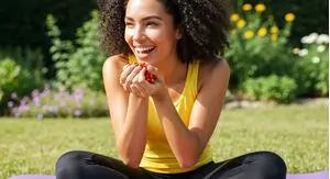 A person with glowing skin and a radiant smile is enjoying a handful of goji berries. The background is a blurred, natural setting, suggesting a healthy and active lifestyle.